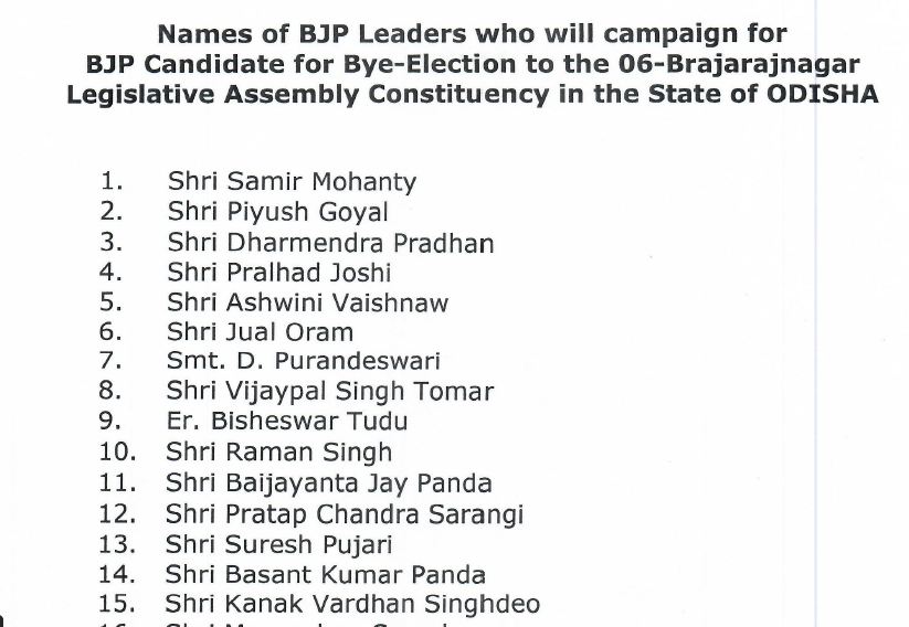 ପ୍ରଚାର ତାଲିକାରେ ସଭାପତି ସମୀର ମହାନ୍ତିଙ୍କ ସହ ପାଞ୍ଚ କେନ୍ଦ୍ର ମନ୍ତ୍ରୀ ପିୟୂଷ ଗୋଏଲ, ଧର୍ମେନ୍ଦ୍ର ପ୍ରଧାନ, ପ୍ରହ୍ଲାଦ ଯୋଶୀ, ଅଶ୍ଵିନ ବୈଷ୍ଣବ ଏବଂ ବିଶେଶ୍ଵର ଟୁଡୁଙ୍କ ସହ ବରିଷ୍ଠ ନେତା ଜୁଏଲ ଓରାମ, ଓଡିଶା ରାଜ୍ୟ ପ୍ରଭାରୀ ଡ.ପୁରନ୍ଦେଶ୍ଵରୀ,ଭୁବନେଶ୍ଵର ସାଂସଦ ଅପରାଜିତା ଷଡଙ୍ଗୀ, ବୈଜୟନ୍ତ ପଣ୍ଡା, ପ୍ରତାପ ଷଡଙ୍ଗୀ ଅଛନ୍ତି। ଉଲ୍ଲେଖନୀୟ ବ୍ରଜରାଜନଗର ଉପ ନିର୍ବାଚନରେ ବିଜେପି ରାଧାରାଣୀ ପଣ୍ଡାଙ୍କୁ ପ୍ରାର୍ଥୀ କରିଛି।