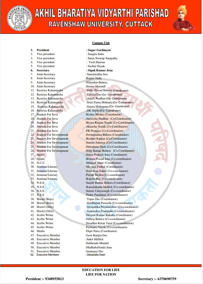 ସଂଜୟ ଶତପଥୀ(କଟକ): ରେଭେନ୍ସା ବିଶ୍ଵବଦ୍ୟାଳୟରେ ଭାରତୀୟ ବିଦ୍ୟାର୍ଥୀ ପରିଷଦର କ୍ୟାମ୍ପସ ୟୁନିଟ୍ ଘୋଷଣା ହୋଇ ଯାଇଁଛି।