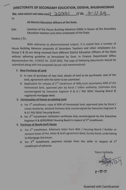 ଚିଠିରେ ଉଲ୍ଲେଖ ରହିଛି ଯେ, ହାଇସ୍କୁଲ ଶିକ୍ଷକ ଓ କର୍ମଚାରୀମାନେ ଯଦି ପୁରୁଣା ଜମିରେ ନୂଆ କୋଠା ନିର୍ମାଣ କରୁଥିବେ କିମ୍ବା ନିର୍ମିତ ହୋଇଥିବା କୋଠା କିଣିବା ଲାଗି ଚାହୁଁଥିବେ ତାଙ୍କୁ ମଧ୍ୟ ଅଗ୍ରୀମ ଅର୍ଥ ମିଳିବ। ଏସବୁ ପାଇଁ ଆବେଦନକାରୀମାନେ ଆବଶ୍ୟକ ତଥ୍ୟ ପ୍ରଦାନ କରିବାକୁ କୁହାଯାଇଛି। ଜମିର ମୂଲ୍ୟ ଏବଂ ବିକ୍ରେତାଙ୍କ ଏଗ୍ରିମେଣ୍ଟକୁ ମଧ୍ୟ ଦାଖଲ ଦାଖଲ କରିବା ପାଇଁ କୁହାଯାଇଛି।