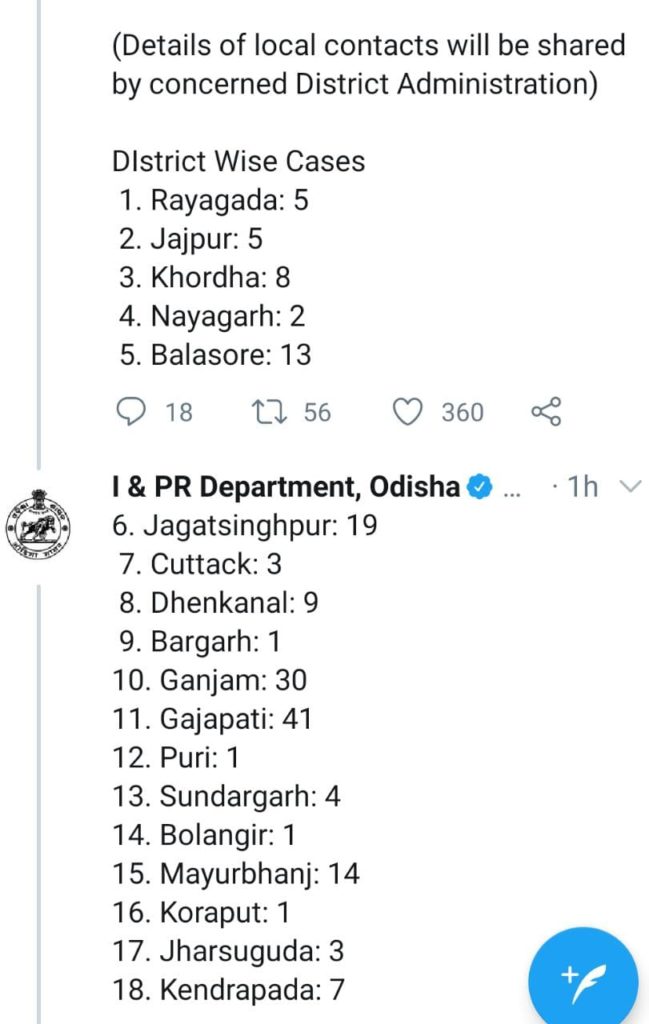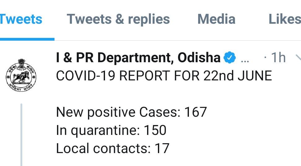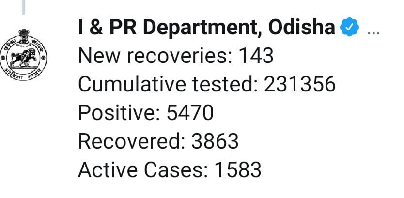 ବାସ୍ତବ ବ୍ୟୁରୋ: ଆଜି ରାଜ୍ୟରେ ୧୮ଟି ଜିଲ୍ଲାରୁ ନୂଆ ୧୬୭ଜଣ କରୋନା ପଜିଟିଭ୍ ଚିହ୍ନଟ ହୋଇଛନ୍ତି । ଏବେ ମୋଟ୍ ଆକ୍ରାନ୍ତଙ୍କ ସଂଖ୍ୟା ୫୪୭୦କୁ ବୃଦ୍ଧି ପାଇଛି । ୧୬୭ଜଣଙ୍କ ଭିତରୁ ୧୭ଜଣ ସ୍ଥାନୀୟ ସଂକ୍ରମିତ ଥିବା ବେଳେ ବାକି ୧୫୦ଜଣ ସଙ୍ଗରୋଧ କେନ୍ଦ୍ରର । ମୋଟ୍ ୩୮୬୩ଜଣ ସୁସ୍ଥ ହୋଇ ଘରକୁ ଫେରିଥିବା ବେଳେ ସକ୍ରିୟ କରୋନା ସଂକ୍ରମିତଙ୍କ ସଂଖ୍ୟା ୧୫୮୩ ରହିଛି । ୧୭ ଜଣ କରୋନା ସଂକ୍ରମିତଙ୍କ ମୃତ୍ୟୁ ହୋଇଛି । ଏ ନେଇ ରାଜ୍ୟ ସୂଚନା ଓ ଲୋକସଂପର୍କ ବିଭାଗ ପକ୍ଷରୁ ସୂଚନା ଦିଆଯାଇଛି ।