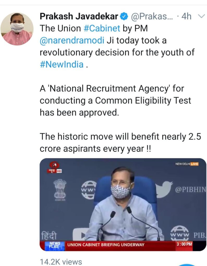 ନରେନ୍ଦ୍ର ମୋଦୀ ଟ୍ୱିଟ୍ କରି କହିଛନ୍ତି, “# ନ୍ୟାସନାଲ ରିକ୍ରୁମେଣ୍ଟେ ଏଜେନ୍ସି କୋଟି କୋଟି ଯୁବକମାନଙ୍କ ପାଇଁ ଏକ ଉତ୍ସାହ ବୋଲି ପ୍ରମାଣିତ ହେବ । ସାଧାରଣ ଯୋଗ୍ୟତା ପରୀକ୍ଷା ମାଧ୍ୟମରେ ଏହା ଏକାଧିକ ପରୀକ୍ଷାକୁ ଦୂର କରିବ ଏବଂ ମୂଲ୍ୟବାନ ସମୟ ତଥା ଉତ୍ସ ମଧ୍ୟ ସଞ୍ଚୟ କରିବ । ଏହା ମଧ୍ୟ ସ୍ୱଚ୍ଛତା ପାଇଁ ବହୁତ ସହାୟକ ହେବ।”