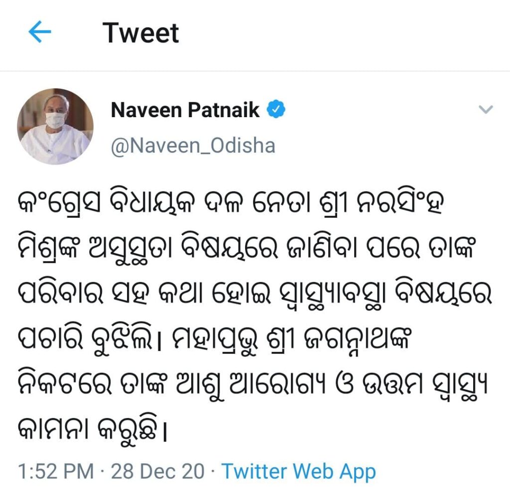 ନରସିଂହ ମିଶ୍ରଙ୍କ ସ୍ବାସ୍ଥ୍ୟାବସ୍ଥା ସଂପର୍କରେ ଜାଣିବା ପରେ ମୁଖ୍ୟମନ୍ତ୍ରୀ ଟ୍ବିଟ୍ କରି ତାଙ୍କ ଆଶୁ ଆରୋଗ୍ୟ କାମନା କରିଛନ୍ତି। ସେ ଟ୍ବିଟ୍ରେ ଲେଖିଛନ୍ତି ଯେ, କଂଗ୍ରେସ ବିଧାୟକ ଦଳର ନେତା ନରସିଂହ ମିଶ୍ରଙ୍କ ସ୍ବାସ୍ଥ୍ୟାବସ୍ଥା ସଂପର୍କରେ ତାଙ୍କ ପରିବାର ସଦସ୍ୟଙ୍କ ଠାରୁ ପଚାରି ବୁଝିଛନ୍ତି। ମହାପ୍ରଭୁ ଜଗନ୍ନାଥଙ୍କ ନିକଟରେ ତାଙ୍କ ଆଶୁ ଆରୋଗ୍ୟ ଓ ଉତ୍ତମ ସ୍ବାସ୍ଥ୍ୟ କାମନା କରିଛନ୍ତି।