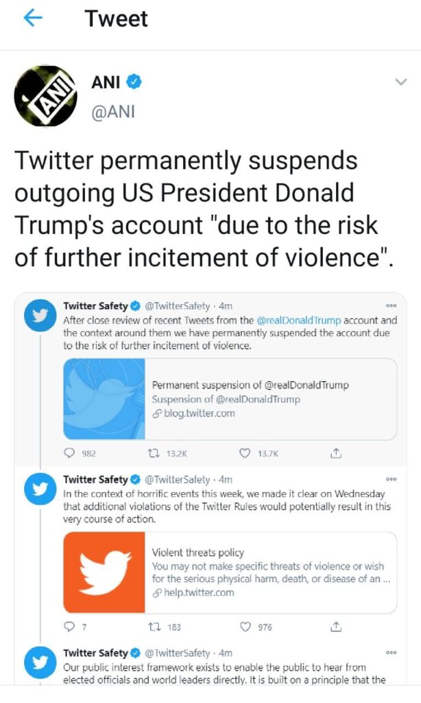 ଟ୍ୱିଟର କହିଛି- ଟ୍ରମ୍ପଙ୍କ ଆକାଉଣ୍ଟରୁ ଟୁଇଟ୍ ଉପରେ ତୀକ୍ଷ୍ଣ ନଜର ରଖିବା ପରେ ଆମେ ଜାଣିବାକୁ ପାଇଲୁ ଯେ ତାଙ୍କୁ କିପରି ନିଆଯାଉଛି। ଅଧିକ ବିପଦକୁ ଦୃଷ୍ଟିରେ ରଖି ଆମେ ତାଙ୍କ ଆକାଉଣ୍ଟକୁ ସବୁଦିନ ପାଇଁ ବନ୍ଦ କରିବାକୁ ନିଷ୍ପତ୍ତି ନେଇଛୁ।