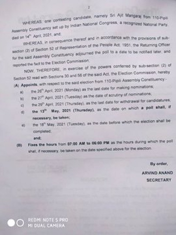 ଆପଣମାନେ ଜାଣିଛନ୍ତିକି ପ୍ରଦୀପ ମହାରଥୀଙ୍କ ବିୟୋଗ ରେ ଖାଲିଥିବା ପିପିଲି ପାଇଁ ହେଉଥିବା ଉପନିର୍ବାଚନରେ , , କଂଗ୍ରେସ ପକ୍ଷରୁ ପ୍ରାର୍ଥୀ ହୋଇଥିବା ଅଜିତ ମଙ୍ଗରାଜଙ୍କ ମୃତ୍ୟୁ ପରେ ନିର୍ବାଚନ ସ୍ଥଗିତ ରହିଥିଲା । ଆଜି ଉପନିର୍ବାଚନ ପାଇଁ ପୁଣି ବିଜ୍ଞପ୍ତି ପ୍ରକାଶ ପାଇଛି । ନିର୍ବାଚନ କମିଶନଙ୍କ ପକ୍ଷରୁ ପ୍ରକାଶ ପାଇଥିବା ବିଜ୍ଞପ୍ତି ଅନୁସାରେ,ମେ’ ୧୩ ତାରିଖରେ ନିର୍ବାଚନ ହେବଏବଂ ୧୬ ତାରିଖରେ ଭୋଟ୍ ଗଣତି ହେବ । ତେବେ ଅଜିତ୍ଙ୍କ ପରେ କଂଗ୍ରେସ କାହାକୁ ପ୍ରାର୍ଥୀ କରିବ ତାହା ଦଳ ପକ୍ଷରୁ କିଛି ବିଧିବଦ୍ଧ ଘୋଷଣା କରାଯାଇ ନାହିଁ |