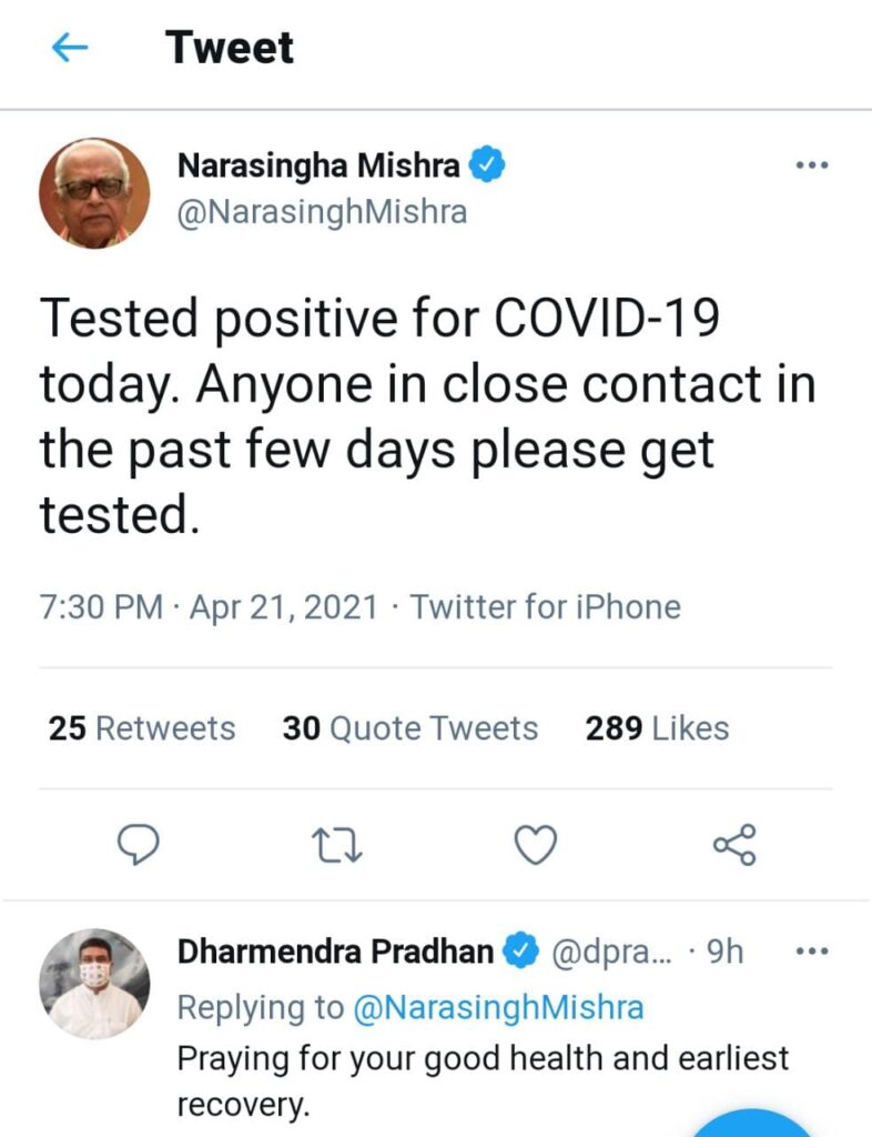 ବାସ୍ତବବ୍ୟୁରୋ: କରୋନା ସାରା ଦେଶକୁ କବଳିତ କରିବାରେ ଲାଗିଛି ,ନେତା ,ଅଭିନେତା ବା ସାଧାରଣ ଜନତା ସମସ୍ତେ ଆତଙ୍କିତ | ଘରୁ ପଦାକୁ ଗୋଡ କାଢ଼ିବାକୁ ଡର,ଏବେ କଂଗ୍ରେସର ବରିଷ୍ଠ ବିଧାୟକ,ତଥା ବିଧାୟକ ଦଳ ନେତା ନରସିଂହ ମିଶ୍ର କୋଭିଡ ପଜିଟିଭ୍ ଚିହ୍ନଟ ହୋଇଛନ୍ତି । ଏ ସଂପର୍କରେ ସେ ଟ୍ବିଟ୍ କରି ସୂଚନା ଦେଇଛନ୍ତି ।