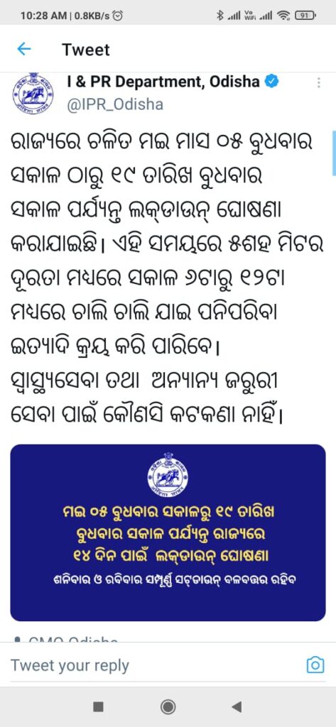 ରାଜ୍ୟ ସୂଚନା ଓ ପ୍ରସାରଣ ବିଭାଗ ପକ୍ଷରୁ ଲକଡାଉନ୍ ନେଇ ଘୋଷଣା କରାଯାଇଛି ।ରାଜ୍ୟରେ ଚଳିତ ମଇ ମାସ ୦୫ ତାରିଖ ବୁଧବାର ସକାଳ ଠାରୁ ୧୯ ତାରିଖ ବୁଧବାର ସକାଳ ପର୍ଯ୍ୟନ୍ତ ଲକ୍ଡାଉନ୍ । ଏହି ସମୟରେ ସମସ୍ତ ସାଧାରଣ ଚଳାଚଳ ବନ୍ଦ ରହିବ । କେବଳ ଜରୁରୀକାଳିନ ସେବା ଜାରି ରହିବ ।