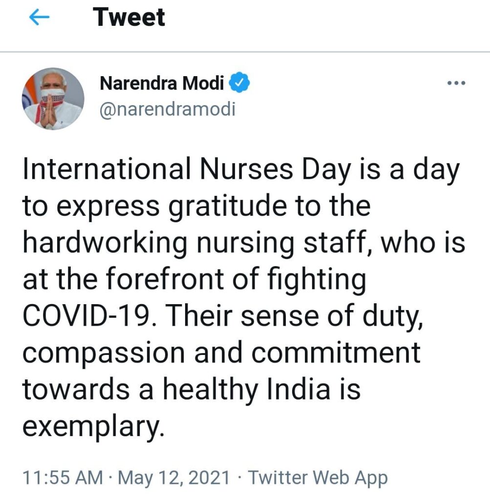 ଆନ୍ତର୍ଜାତୀୟ ନର୍ସ ଦିବସ ଅବସରରେ ମୋଦୀ ଟ୍ୱିଟ୍ କରି କହିଛନ୍ତି ଯେ କୋଭିଡ -୧୯ ବିପକ୍ଷରେ ସାମ୍ନା ଯୁଧ୍ୟରେ ନିୟୋଜିତ କରାଯାଇଥିବା ପରିଶ୍ରମୀ ରାଷ୍ଟ୍ର ନର୍ସମାନଙ୍କୁ ଆନ୍ତର୍ଜାତୀୟ ନର୍ସ ଦିବସ କୃତଜ୍ଞତାର ଦିନ। ଏକ ସୁସ୍ଥ ଭାରତ ପ୍ରତି ତାଙ୍କର କର୍ତ୍ତବ୍ୟ, ଉତ୍ସାହ ଏବଂ ପ୍ରତିବଦ୍ଧତା ଉତ୍କୃଷ୍ଟ ବୋଲି ସେ କହିଛନ୍ତି।